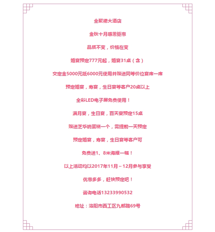 送溫暖!全聚德大酒店新品燉菜火熱上市 讓這個冬天不再寒冷 發(fā)布時間:2017-10-28來源:點擊:2335 洛陽餐旅 宴會專家全國預訂客服熱線:400-616-3939微信號:hacyly股票代碼:836977長按二維碼識別后添加關(guān)注以上信息來源于洛陽餐旅集團官網(wǎng):www.yvnqwmt.cn 分享到:0 用手機看 拍下二維碼,信息隨身看 試試用微信掃一掃,在你手機上繼續(xù)觀看此頁面。 上一篇:送溫暖!宴天下老城店新品燉菜火熱上市 讓這個冬天不再寒冷 下一篇:洛陽餐旅集團旗下各店2017年11月-2018年2月可預訂宴會日期一覽表(10.30更新)