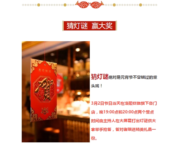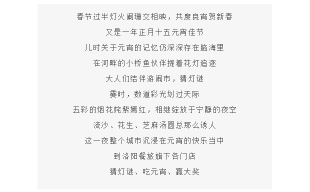 猜燈謎 贏大獎(jiǎng) 美味元宵送給您 發(fā)布時(shí)間:2018-02-26來源:點(diǎn)擊:2294 洛陽餐旅 宴會(huì)專家全國預(yù)訂客服熱線:400-616-3939微信號(hào):hacyly股票代碼:836977長按二維碼識(shí)別后添加關(guān)注以上信息來源于洛陽餐旅集團(tuán)官網(wǎng):www.yvnqwmt.cn 分享到:0 用手機(jī)看 拍下二維碼,信息隨身看 試試用微信掃一掃,在你手機(jī)上繼續(xù)觀看此頁面。 上一篇:洛陽餐旅集團(tuán)誠聘精英 牽手餐旅 共圖大業(yè)! 下一篇:洛陽全聚德大酒店管理人員到洛陽旅發(fā)集團(tuán)旗下華夏喜慶文化博物館民間傳統(tǒng)喜慶文化展廳參觀學(xué)習(xí)