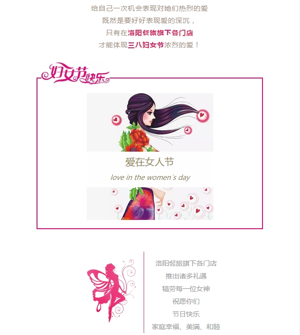 3.8女神節(jié) 壕禮接二連三到 發(fā)布時(shí)間:2018-03-06來(lái)源:點(diǎn)擊:2452 洛陽(yáng)餐旅 宴會(huì)專家全國(guó)預(yù)訂客服熱線:400-616-3939微信號(hào):hacyly股票代碼:836977長(zhǎng)按二維碼識(shí)別后添加關(guān)注以上信息來(lái)源于洛陽(yáng)餐旅集團(tuán)官網(wǎng):www.yvnqwmt.cn 分享到:0 用手機(jī)看 拍下二維碼,信息隨身看 試試用微信掃一掃,在你手機(jī)上繼續(xù)觀看此頁(yè)面。 上一篇:洛陽(yáng)華夏喜慶文化博物館與中國(guó)寶豐汝窯博物館互動(dòng)交流學(xué)習(xí) 下一篇:北京紅日時(shí)代(中國(guó)食療養(yǎng)生專委會(huì))到洛陽(yáng)餐旅旗下各店參觀考察