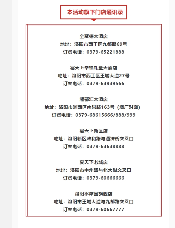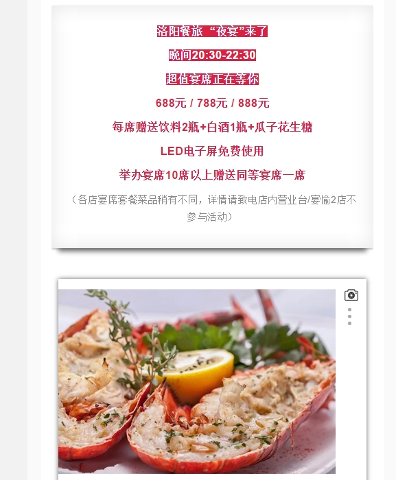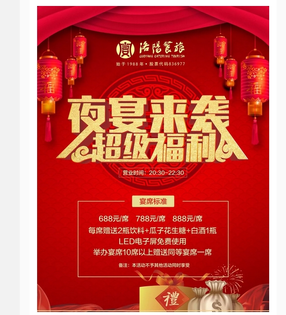 夜宴 | 誰說晚了就吃不到包桌?洛陽餐旅晚間宴席全城鉅惠(聚會)! 發(fā)布時間:2018-05-06來源:點擊:3885 洛陽餐旅 宴會專家全國預訂客服熱線:400-616-3939微信號:hacyly股票代碼:836977長按二維碼識別后添加關(guān)注以上信息來源于洛陽餐旅集團官網(wǎng):www.yvnqwmt.cn 分享到:0 用手機看 拍下二維碼,信息隨身看 試試用微信掃一掃,在你手機上繼續(xù)觀看此頁面。 上一篇:60天! 幸福新娘決戰(zhàn)在即!抓緊上車一起贏取十萬大獎! 下一篇:洛陽餐旅旗下各店2018年5月-8月可預訂宴會日期一覽表(5.7更新)
