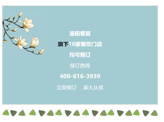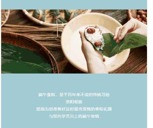 端午福粽 · 洛陽餐旅福粽禮盒開始火熱預(yù)訂了! 發(fā)布時(shí)間:2018-05-18來源:點(diǎn)擊:2604 洛陽餐旅 宴會專家全國預(yù)訂客服熱線:400-616-3939微信號:hacyly股票代碼:836977長按二維碼識別后添加關(guān)注 分享到:0 用手機(jī)看 拍下二維碼,信息隨身看 試試用微信掃一掃,在你手機(jī)上繼續(xù)觀看此頁面。 上一篇:洛陽餐旅旗下各店2018年6月-9月可預(yù)訂宴會日期一覽表(5.7更新) 下一篇:河南科技大學(xué)藝術(shù)與設(shè)計(jì)學(xué)院“文創(chuàng)實(shí)踐基地”落戶洛陽華夏喜慶文化博物館