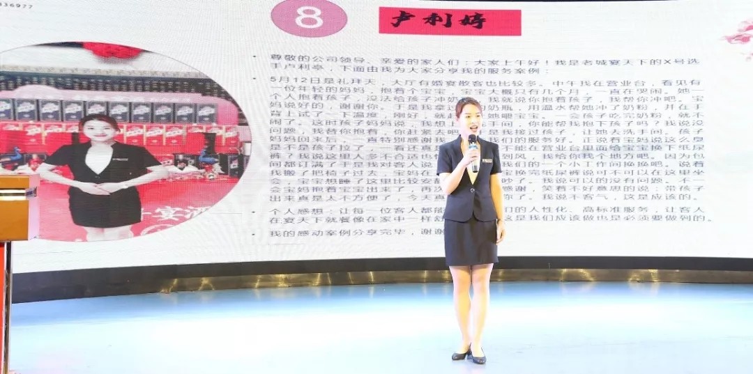 評(píng)選活動(dòng)在充滿激情的《歡宴天下》歌聲中拉開序幕,來自各子公司的21名***員工代表上臺(tái)分享了各自的感動(dòng)服務(wù)案例。如:為母親節(jié)給客人私人訂制餐臺(tái)布置和母親節(jié)榮譽(yù)證書;替抱孩子的母親給嬰兒沖奶粉;為喝醉酒的客人叫出租車,并墊付車費(fèi),攙扶客人上車等。這些案例緊扣感動(dòng)服務(wù)這一主題,形式多樣,感人至深,受到評(píng)委及廣大員工的贊揚(yáng)。