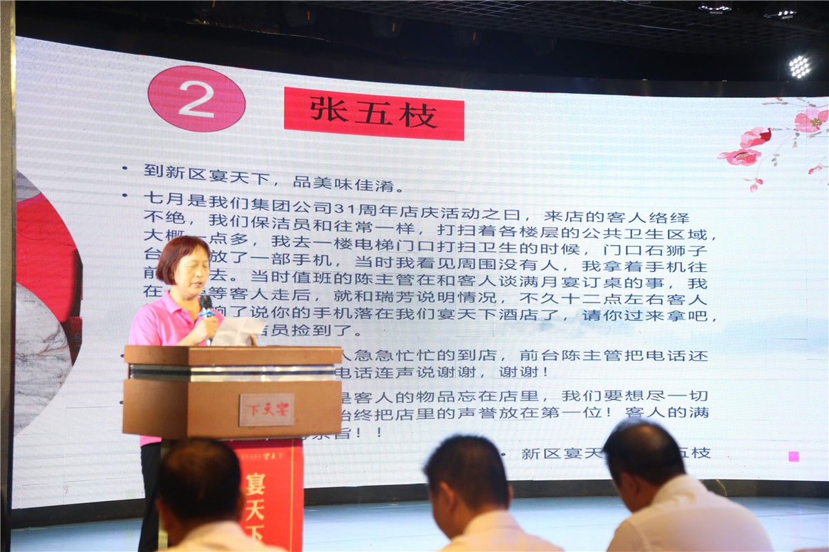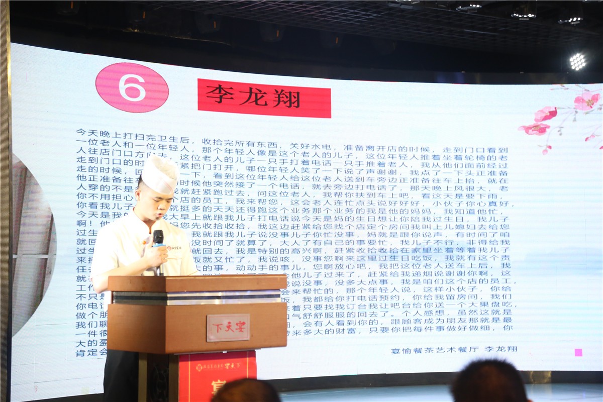 評(píng)選活動(dòng)在充滿激情的《歡宴天下》歌聲中拉開(kāi)序幕,來(lái)自各子公司的21名***員工代表上臺(tái)分享了各自的感動(dòng)服務(wù)案例。如:為定壽宴的客人訂制壽宴餐臺(tái);為小升初的孩子訂制難忘的童年回憶;拾金不昧想盡一切辦法歸還手機(jī);為辦生日宴的小寶寶準(zhǔn)備抓周游戲;為腳踝起包的客人準(zhǔn)備薄荷葉和冰塊,幫客人消腫止癢等。這些案例緊扣感動(dòng)服務(wù)這一主題,形式多樣,感人至深,受到評(píng)委及廣大員工的贊揚(yáng)。
