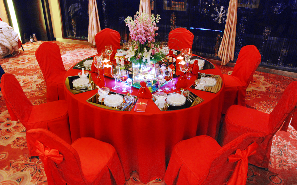 新區(qū)店餐臺整體以中國紅為主要元素,獨(dú)特的水晶鏡面餐臺中央擺放著插滿紫羅蘭與百合的花束,暗香浮動,在熒熒燭火的點綴下,流光溢彩,浪漫溫馨。