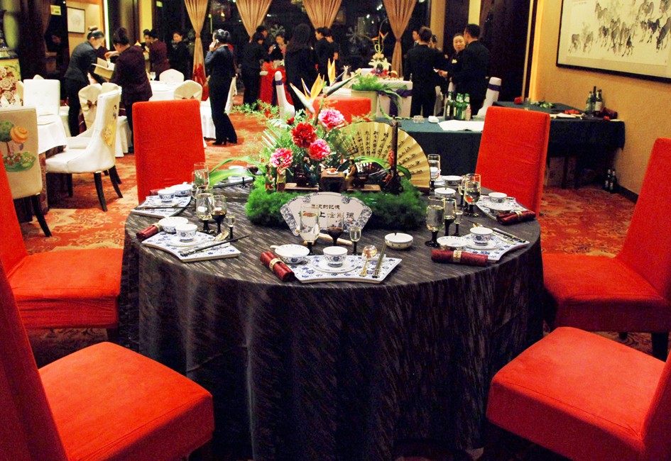 湘鄂匯大酒店的餐臺設(shè)計名為“步步高”,***商務(wù)宴色彩。印有牡丹花紋的臺布及餐具寓意洛陽餐飲旅游集團(tuán)公司的發(fā)源地是在洛陽,牡丹花也是國花,預(yù)示著集團(tuán)公司要做洛陽***、河南***、中國知名的餐飲品牌。雙色口布折花與餐桌、靠椅顏色交相呼應(yīng),選色簡潔大方。主題設(shè)計采用三層,分別為插花藝術(shù)、主題意義及雕刻藝術(shù)。底層由鮮花托起的集團(tuán)標(biāo)識尤為醒目。