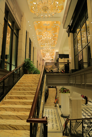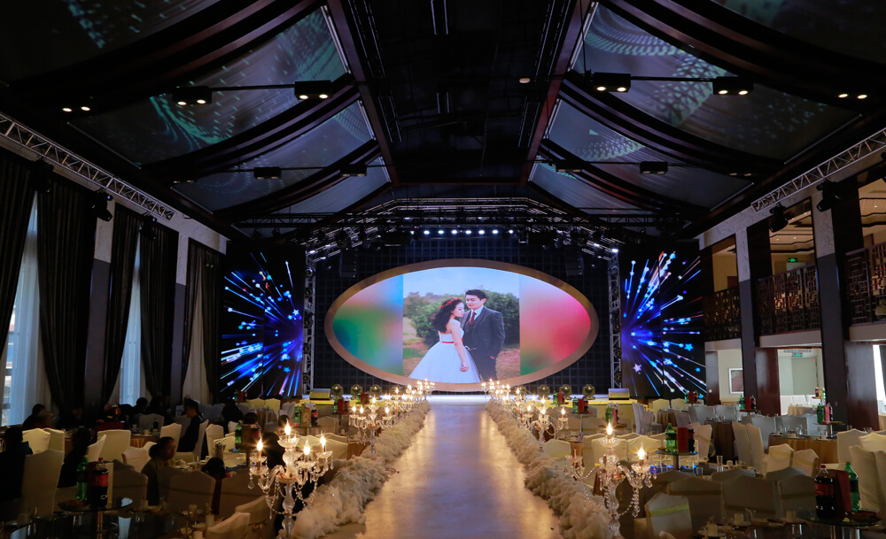 酒店共兩層,由兩大一小三個宴會廳和6個VIP包間組成,可同時接待800余人就餐和舉辦各種宴會活動。兩個大宴會廳面積均為680平方米,可分別接待360人出席宴會。酒店裝修風格典雅大氣,浪漫唯美,超凡的層高顯示出恢弘的氣度;拱形穹頂、羅馬廊柱、玫瑰色主基調(diào),彰顯出歐式浪漫時尚風格,營造出非同凡響的喜慶空間。錯層舞臺設計,超前的燈光、音響設備代表著強大的領先科技水平。而獨具特色的服務、富于創(chuàng)新的菜品、極具創(chuàng)意的婚慶策劃服務以及貼心的婚房等一站式超值服務,必將給新人以溫馨和驚喜,引領洛陽宴會市場潮頭。