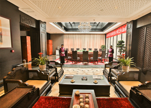 酒店定位為高性價(jià)比豪華主題餐飲酒店,以悠久的帝都?xì)v史和博大精深的河洛文化為載體,巧妙融入牡丹文化,并通過工藝品、名家書畫、詩詞、碑刻、石雕、水系景觀等方式,充分體現(xiàn)出洛陽的文化精髓,使“宴天下”品牌一躍成為帝都新貴。隨著五部觀光電梯在三樓緩緩?fù)O拢陂T打開的同時(shí),一個(gè)居于繁華之上的大隱之境展現(xiàn)于眼前。尊崇闊麗的酒店大堂彰顯著皇家風(fēng)范,別具一格的宴會(huì)前廳顯得通達(dá)敞亮;漫步至三層的多功能宴會(huì)廳里, 6.8米高的無柱大廳顯得異常的高大寬廣、富麗堂皇,獨(dú)有58平米LED全彩高清背景屏、觸控星光大道、專業(yè)級(jí)舞美、頂級(jí)多通道數(shù)字音響、特技電腦燈光、高清實(shí)況轉(zhuǎn)播等,讓我們感受到前衛(wèi)科技與時(shí)尚生活完美結(jié)合所帶來的震撼。